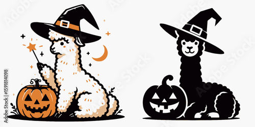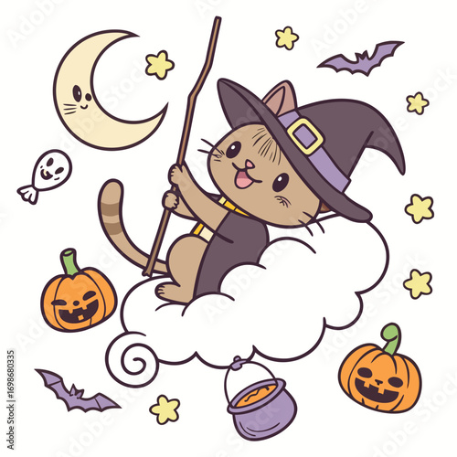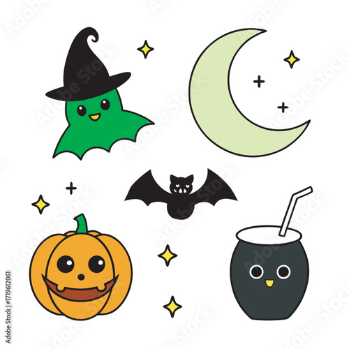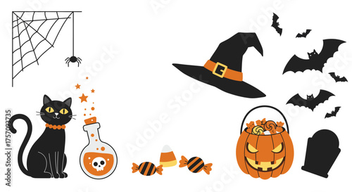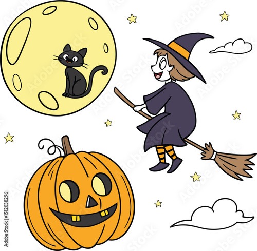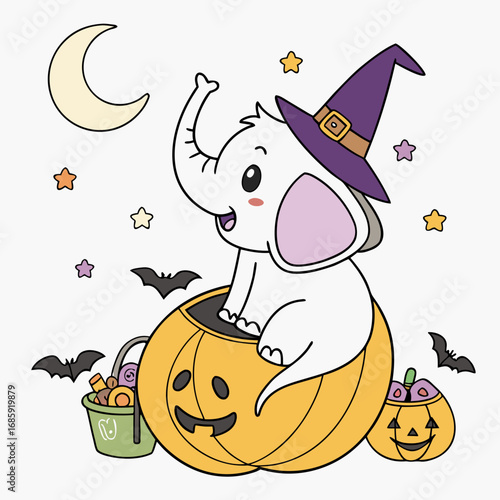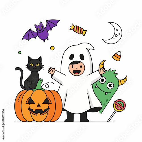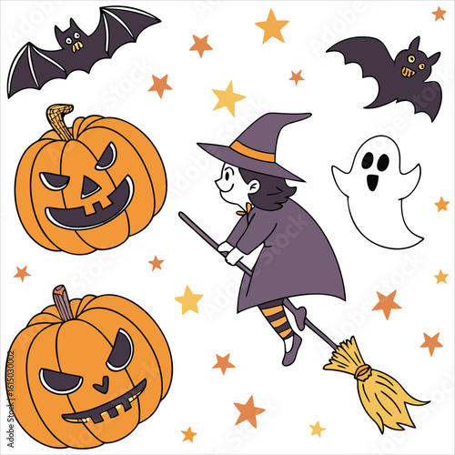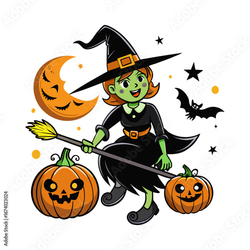 Милая очаровательная маленькая ведьма с векторной иллюстрацией тыквы и летучих мышей. Концепция празднования осеннего карнавала на Хэллоуин.