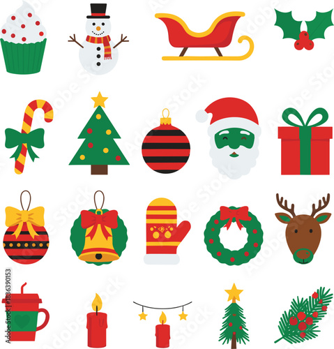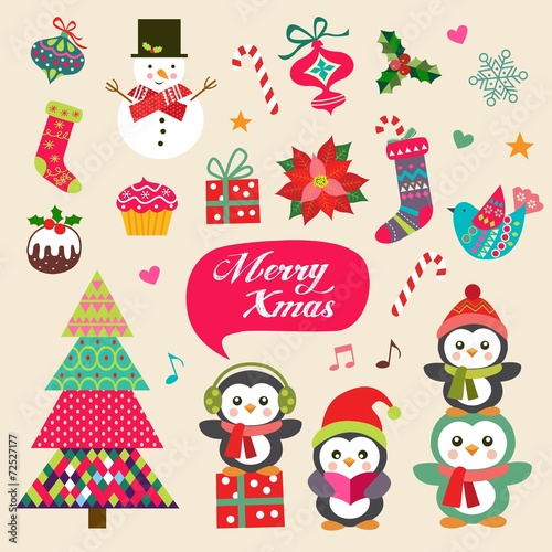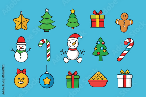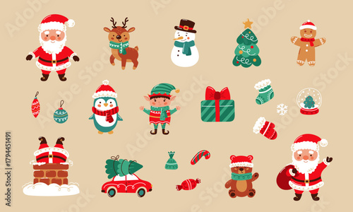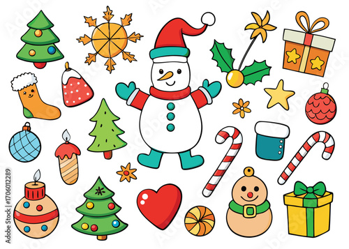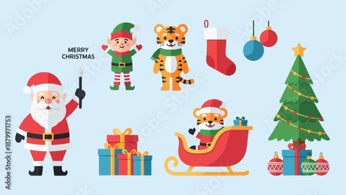 Милый рождественский кот с зимними персонажами, изолированными на белом фоне. Забавный котенок с рождественской подарочной коробкой и безделушками, рядом украшенная ель, обернутая гирляндой векторная иллюстрация