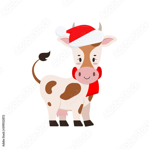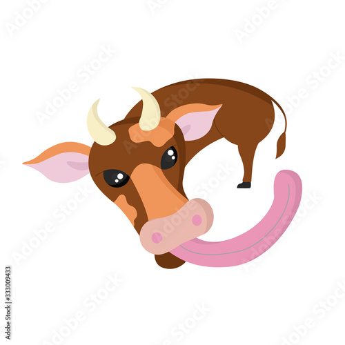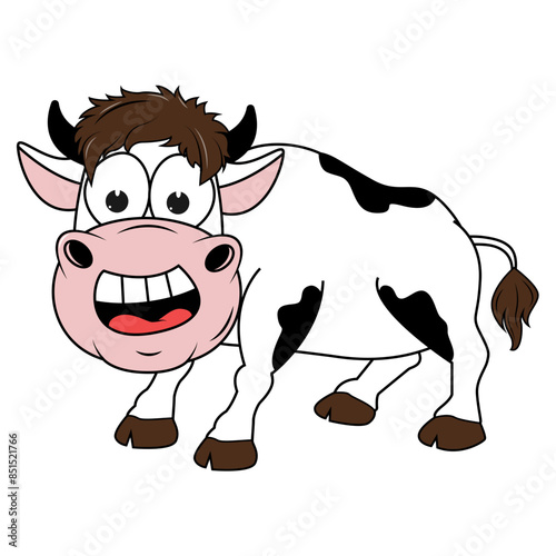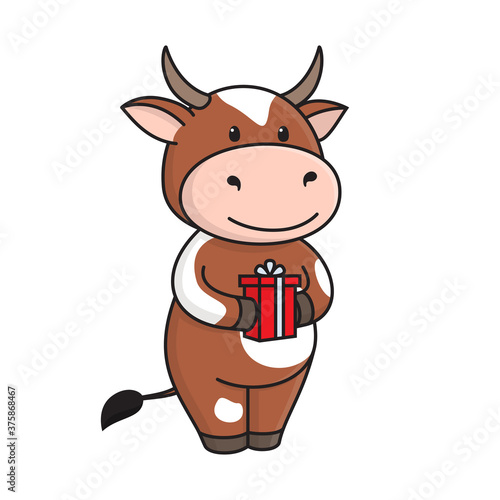 Симпатичный мультяшный персонаж корова держит векторную иконку упаковки из картонной коробки для молока. Забавное сельскохозяйственное животное, рекламирующее свежий продукт. Концепция молочной промышленности и сельского хозяйства