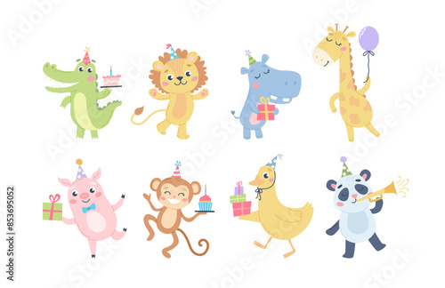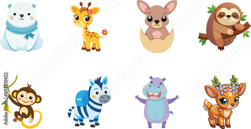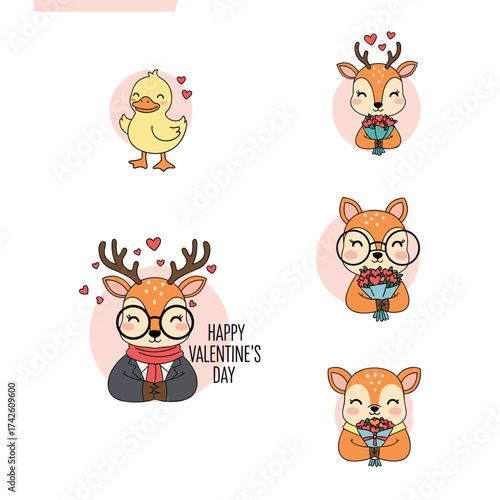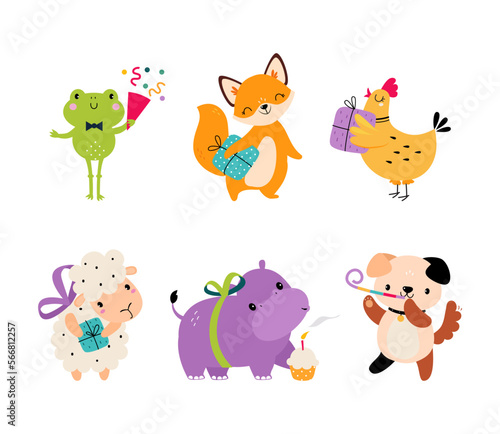 Набор персонажей мультфильма "Счастливая корова", плоская векторная изолированная иллюстрация. Симпатичное фермерское животное, талисман с бутылкой молока и стаканом. Коллекция забавных коров для этикетки на упаковке молочных продуктов.