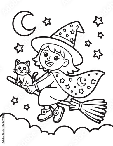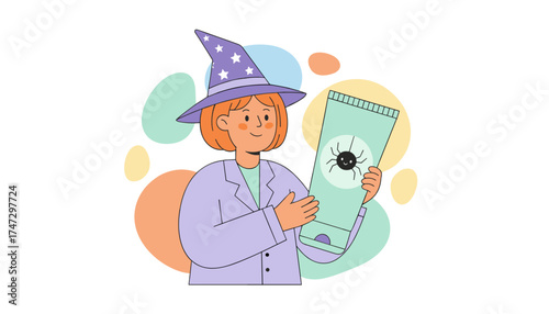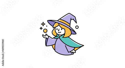 Милая волшебница с векторной иконкой волшебного зелья. Мультяшный персонаж в красивой шляпе, иллюстрация костюма. Ребенок-волшебник из волшебной сказки, изолированный на белом фоне