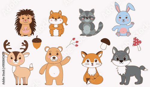 Милые лесные животные в любви, плоская векторная изолированная иллюстрация. Забавный мишка, ежик, белка, лиса, сова, кролик с сердечками, воздушные шары для поздравительной открытки с Днем Святого Валентина, наклейка.