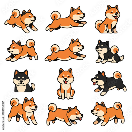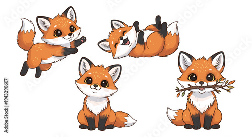 Набор значков Cute fox для поздравительной открытки, приглашения, плаката, наклейки, печати. Векторная изолированная иллюстрация забавных лисиц, сидящих, спящих, прыгающих, летающих, мечтающих, влюбленных, слушающих музыку.
