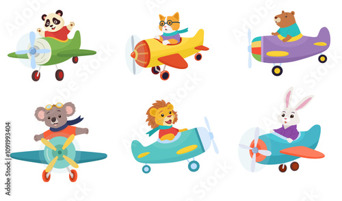Милые животные в пилотских шляпах и очках. Векторная иллюстрация енота, лисы, белки, медведя, оленя, ежа, совы, кролика, летящего на самолете, воздушном шаре, биплане, воздушных шарах, изолированных на белом фоне.