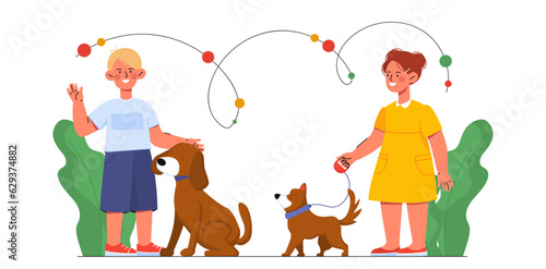 Симпатичная девушка кладет монету в ящик для пожертвований для бродячих и бездомных животных, плоская векторная иллюстрация. Благотворительность для домашних животных, поддержка организаций по спасению животных.