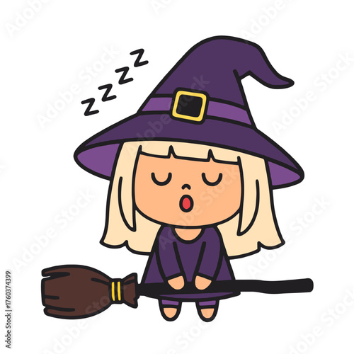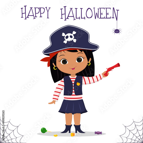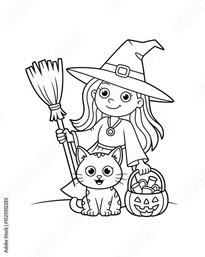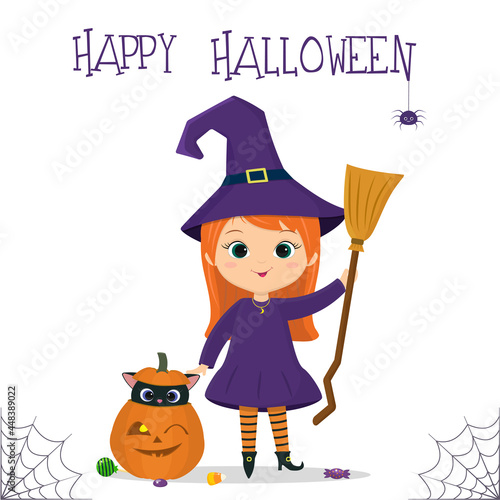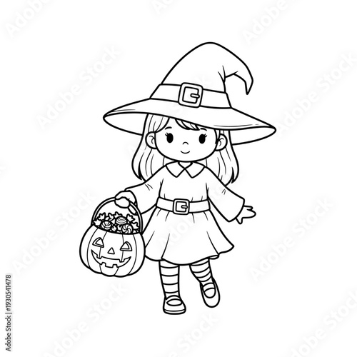 Векторная иллюстрация девушки-ведьмы на Хэллоуин в колдовской шляпе и костюмированном платье, выделенная на белом фоне. Милый ребенок-волшебник, несущий колбу с ядовитым зельем. Концепция празднования осенней вечеринки