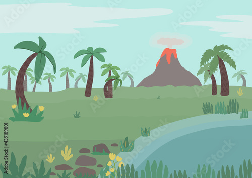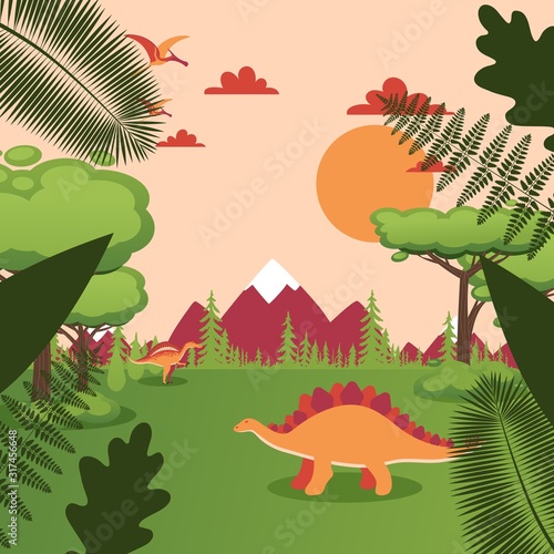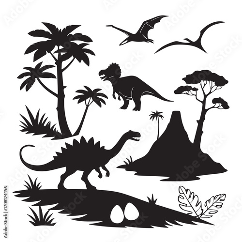 Милый набор персонажей мультфильма динозавр юрского периода, доисторическая природа, вулканы, плоская векторная изолированная иллюстрация. Эпоха динозавров.
