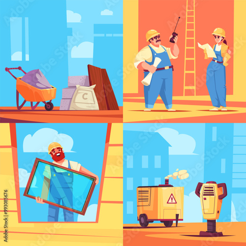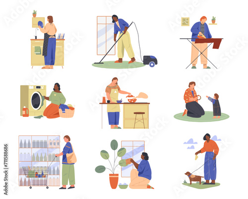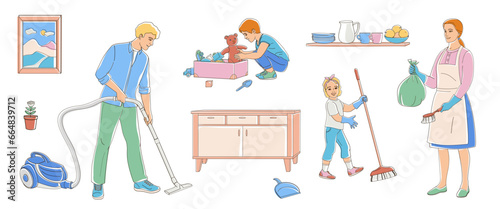 Милые дети, выполняющие работу по дому, плоская векторная изолированная иллюстрация. Мальчики и девочки стирают, убирают дом, пол, моют посуду, поливают комнатные растения, подметают и пылесосят ковер. Домашние заботы