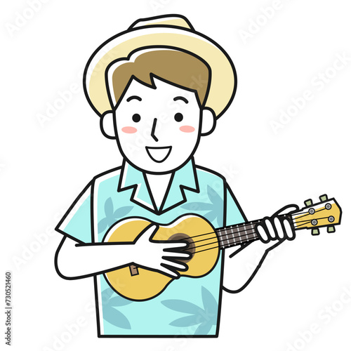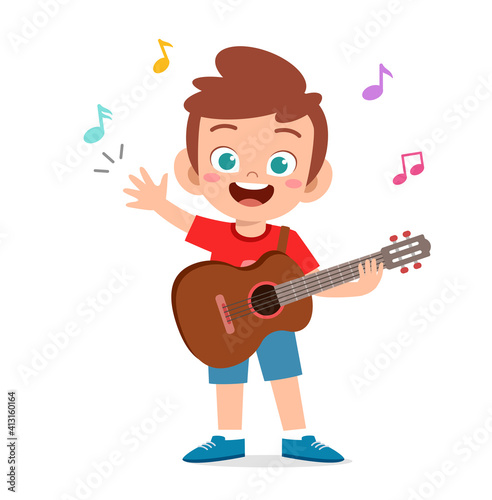 Милый рыцарь в векторе. Мультяшный персонаж-ребенок-средневековый воин в шлеме и доспехах, играющий на гитаре, значок, выделенный на белом фоне