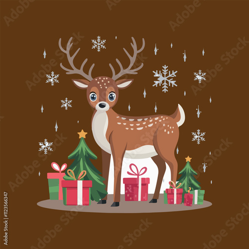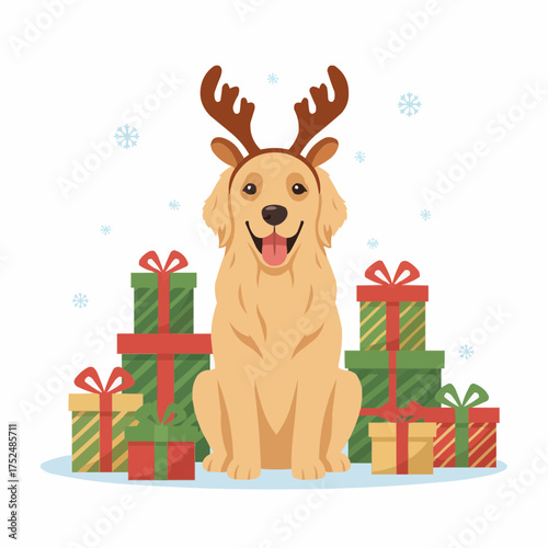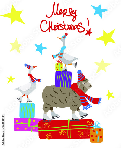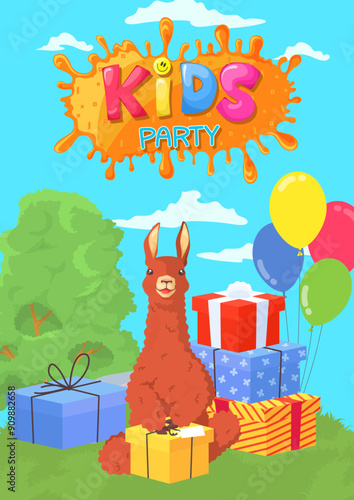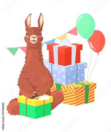 Симпатичная плоская векторная иконка празднования дня рождения животного ламы альпаки. Забавный персонаж ламы сидит возле подарочных коробок и улыбается мультяшной иллюстрации, изолированной на белом фоне
