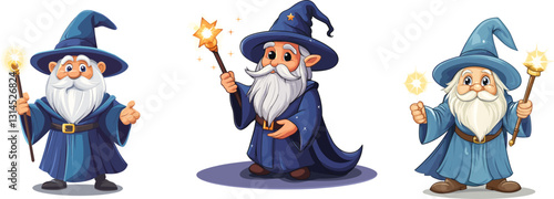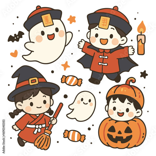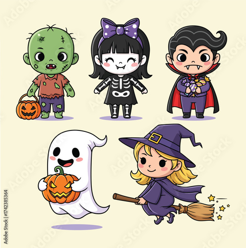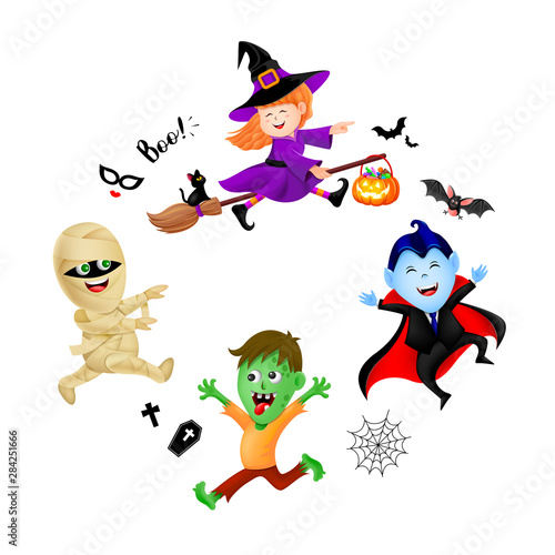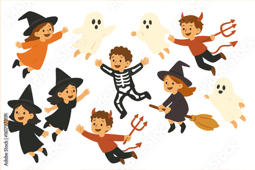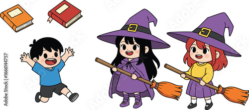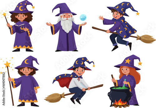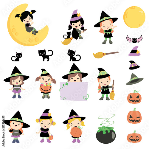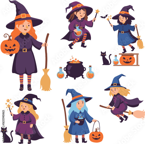 Милые маленькие ведьмочки верхом на метле, готовят зелье в кипящем котле и т.д. Векторная иллюстрация, изолированная на белом фоне. Ведьмы на Хэллоуин для приглашения на вечеринку, плаката, наклейки, печати.