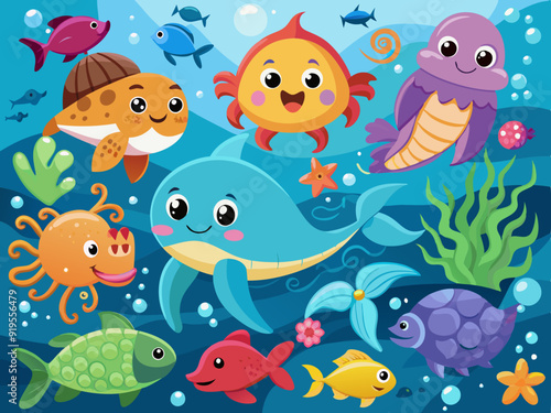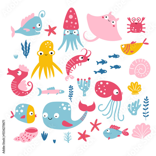Милый набор значков русалки для поздравительной открытки, приглашения, плаката, наклейки, печати. Векторная изолированная иллюстрация красивых плавающих девушек с дельфином, крабом, медузой, морской звездой, рыбой, черепахой и морским коньком