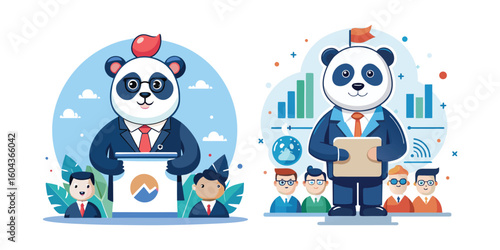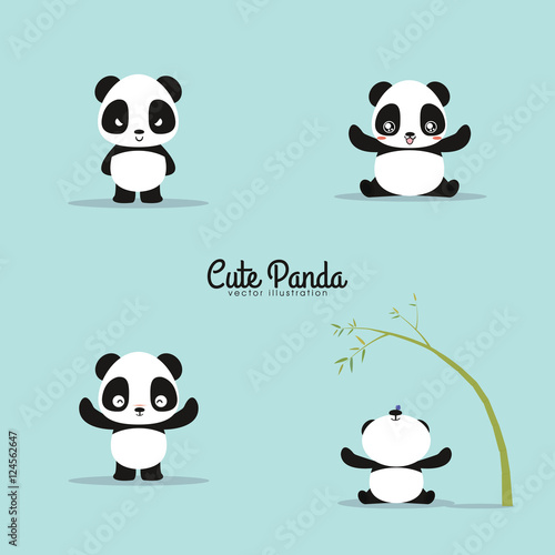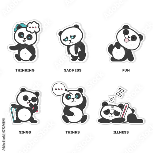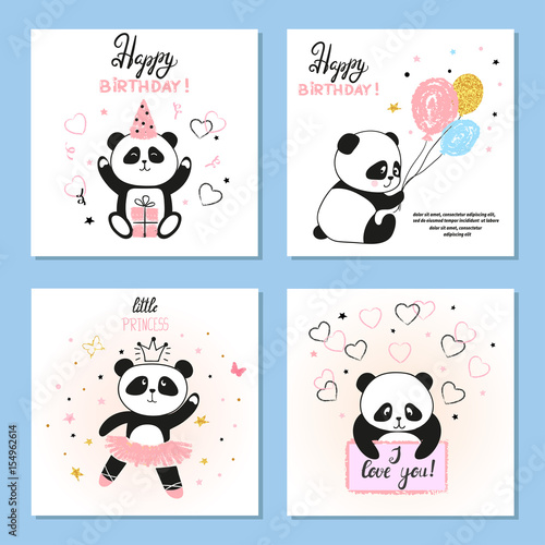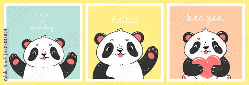 Милые открытки с пандой. Набор векторных шаблонов с забавными пандами с сердечками, воздушным шаром, пончиком, листьями бамбука, чашкой кофе и Спокойной ночи, Доброе утро, Хороший день, Привет, Такой милый, Прекрасный текст каллиграфии.
