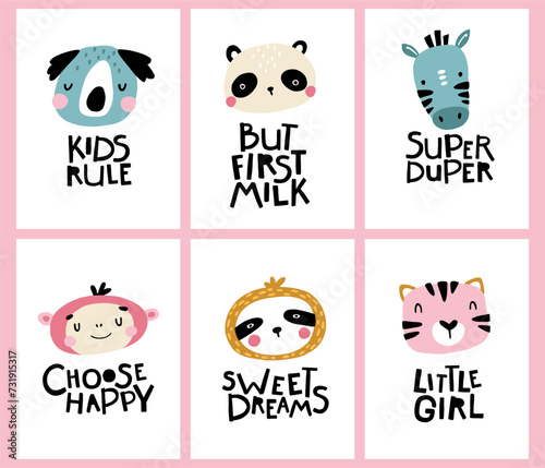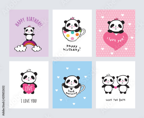 Пригласительные открытки на вечеринку с милой пандой. Набор векторных шаблонов с забавными пандами с сердцем, воздушным шаром, пончиком, подарочной коробкой, флажками для украшения вечеринки и рукописным текстом.