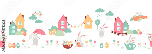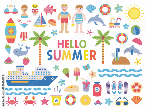 Милые домашние животные отдыхают на пляже набор иконок. Векторная иллюстрация забавных кошек, собак и хомяков, наслаждающихся летним пляжным отдыхом, изолированных на белом фоне.
