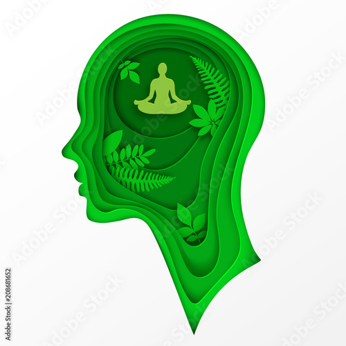 Симпатичная домашняя собачка, ловящая летающий диск внутри силуэта головы человека, векторная иллюстрация в стиле бумажного искусства. Мысли любителя домашних животных, воображение, мечта.