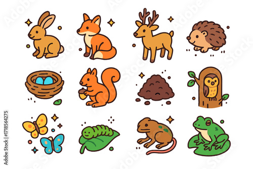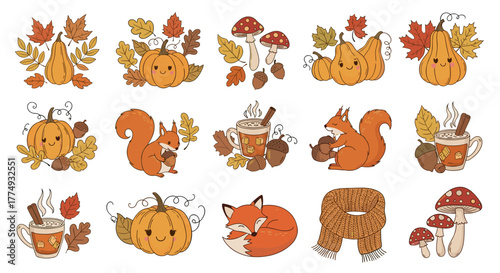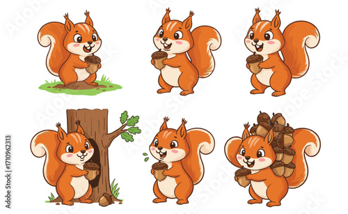 Набор персонажей мультфильма "Милая белка", плоская векторная изолированная иллюстрация. Забавные животные спят, едят желуди, бегают, играют. Лесные дикие животные, различные виды деятельности. Эмодзи, логотип, наклейка.