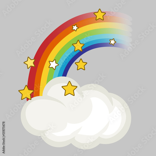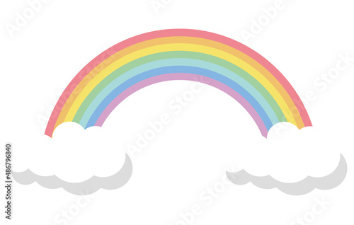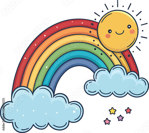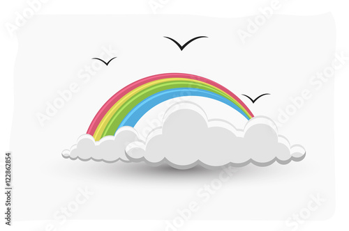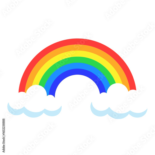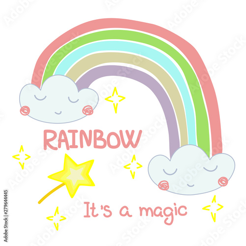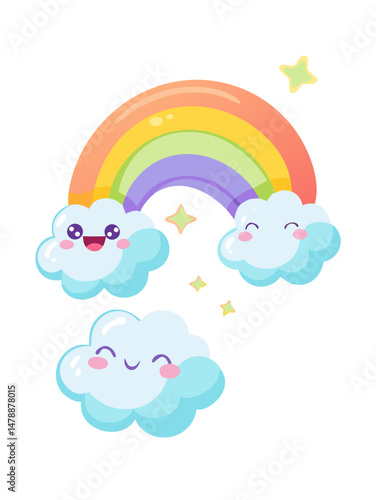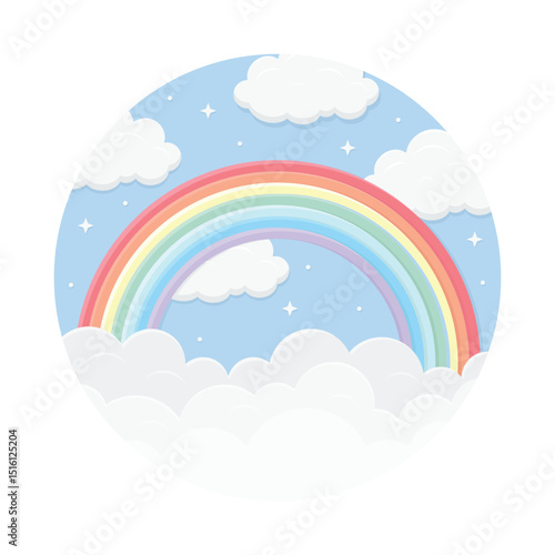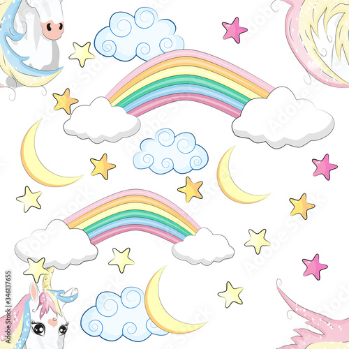 Милый единорог, волшебное существо с одним рогом, радугой и дождливыми облаками. Векторная иллюстрация в современном стиле бумажного искусства.