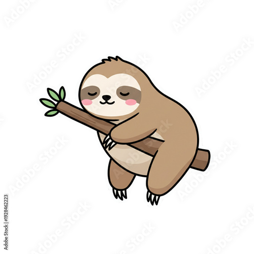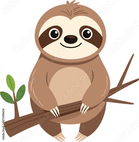 Милый ленивец в векторе. Мультяшное животное с чашкой, сидящее на ветке дерева. Забавный ленивый лесной персонаж наслаждается горячим напитком - кофе или чаем, выделенным на белом фоне