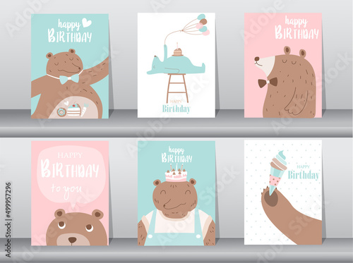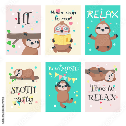 Векторный набор открыток с милыми дикими животными и написанными от руки вдохновляющими цитатами. Забавные лиса, медведь, сова, кролик, молодой олень и панда едят свою любимую еду.
