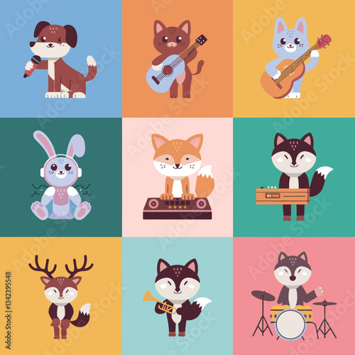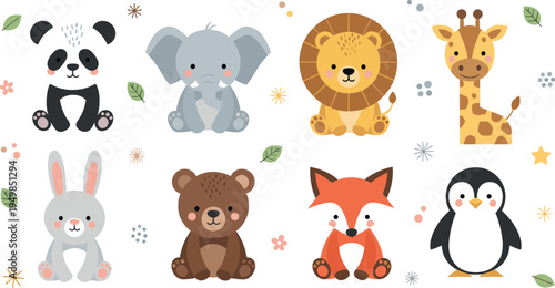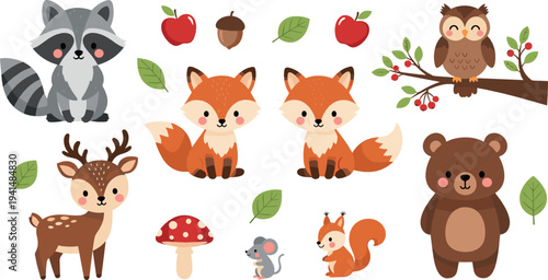 Милые животные с набором иконок еды и напитков. Векторная иллюстрация забавного ежа, лисы, медведя, белки, совы, енота, кролика, оленя и панды, едящих свою любимую еду, изолированную на белом фоне.