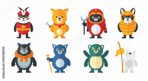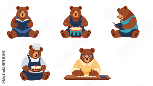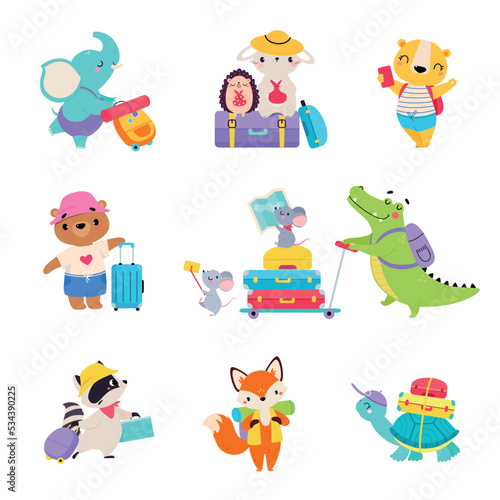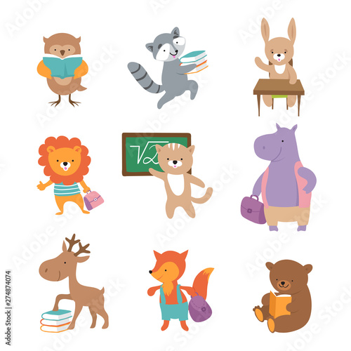 Милые дикие животные с набором иконок книг. Векторная иллюстрация забавного ежа, лисы, медведя, белки, совы, енота, кролика, оленя и панды, читающих книги, изолированные на белом фоне.