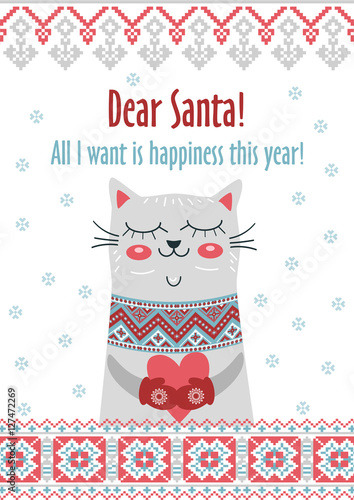 Зимняя кошка в теплом свитере и шапке в векторе. Иллюстрация значка милого домашнего животного. Забавный персонаж-котенок на прогулке. Дизайн каракулей для поздравительной открытки холодного сезона, изолированный на белом фоне