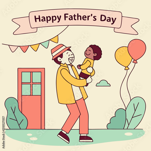 Счастливый отец делает селфи с дочерью, гуляющей в парке, плоская векторная иллюстрация. Папа и ребенок проводят время вместе. Отношения между родителями и детьми, счастливое отцовство и воспитание детей. Мероприятие в честь дня отца.