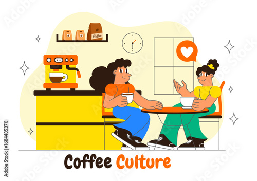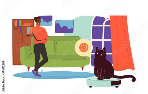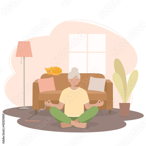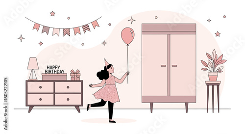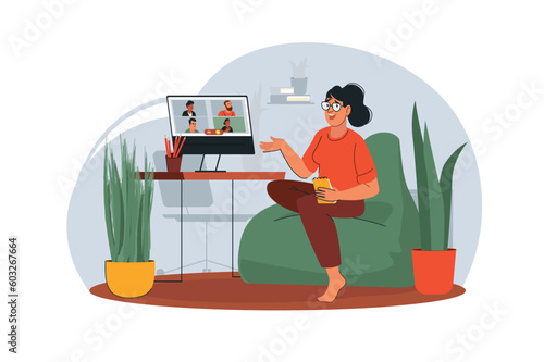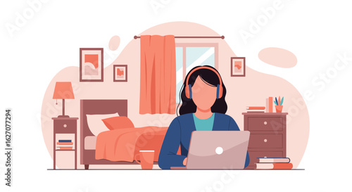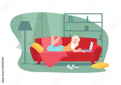 Повседневная жизнь. Молодая женщина просыпается, сидя на кровати с чашкой кофе, бутылкой воды и ноутбуком утром, плоская векторная иллюстрация. Ежедневная утренняя рутина, повседневные действия, привычки.