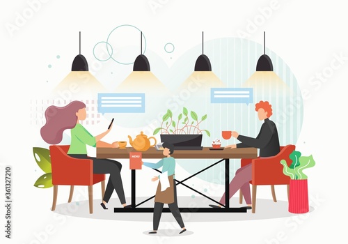 Повседневная жизнь. Молодая женщина завтракает утром, плоская векторная иллюстрация. Счастливая девушка сидит за столом, ест здоровую пищу, пьет чай. Ежедневная утренняя рутина, повседневные дела.