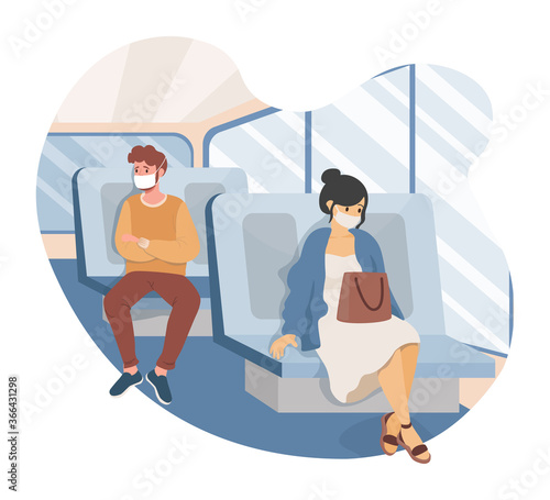 Повседневная жизнь. Молодые мужчина и женщина едут на работу и с работы, плоская векторная иллюстрация. Пассажиры в поезде метро. Ежедневная утренняя, вечерняя рутина, повседневные занятия.