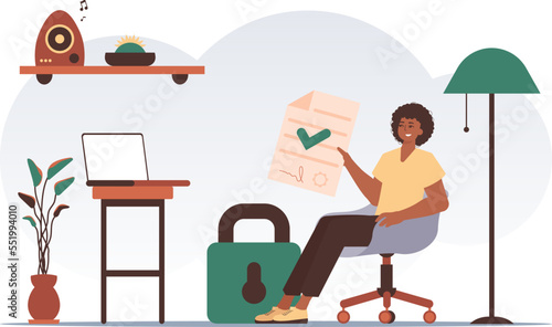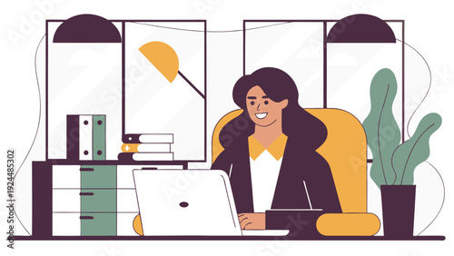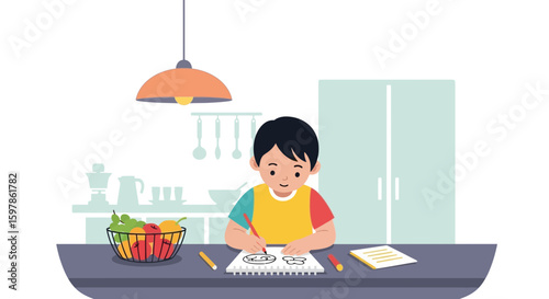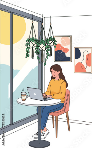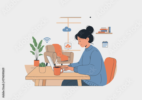 Повседневная жизнь. Молодая женщина завтракает дома, плоская векторная иллюстрация. Счастливая девушка сидит за столом, ест, пьет кофе и пользуется смартфоном. Ежедневная утренняя рутина, повседневные дела.