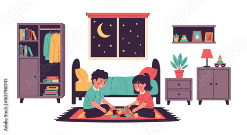 Повседневная жизнь. Молодая женщина читает книгу в своей постели ночью перед сном, плоская векторная иллюстрация. Повседневная рутина, повседневные занятия.