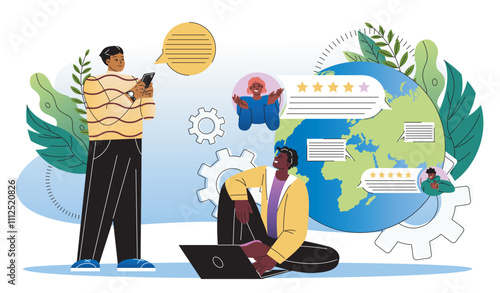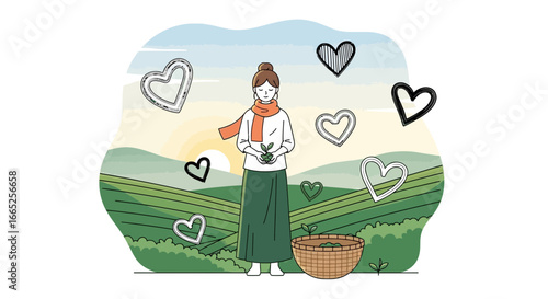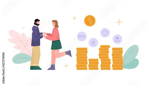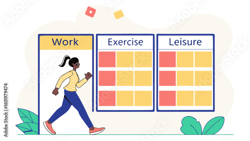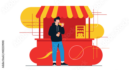 Повседневная жизнь. Молодая женщина ходит по магазинам за продуктами, плоская векторная иллюстрация. Девушка стоит с хозяйственной сумкой, полной продуктов питания, в продуктовом магазине, супермаркете. Повседневная рутина, повседневные занятия.