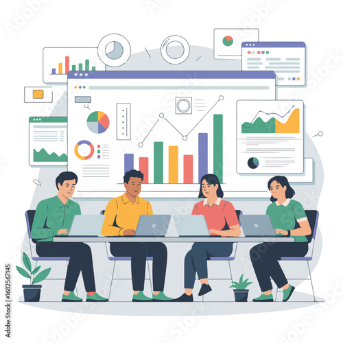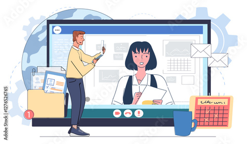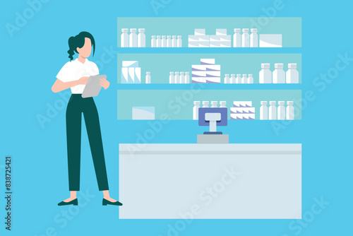 Молочный магазин, плоская векторная иллюстрация. Продавщица стоит у прилавка с молочными бутылками и сыром. Фермерский продовольственный рынок. Супермаркет, продуктовый магазин, секция молочных продуктов, отдел.