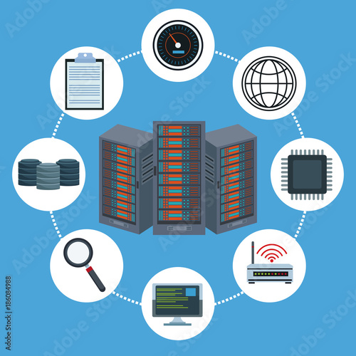 Блок-схема центра обработки данных, векторная иллюстрация. Изометрический портативный компьютер, мобильный телефон, стойки серверной комнаты, Wi-Fi роутер. Облачное хранилище, передача данных.