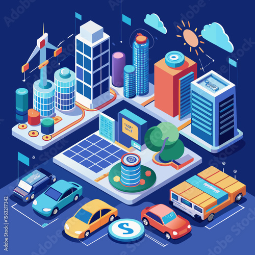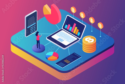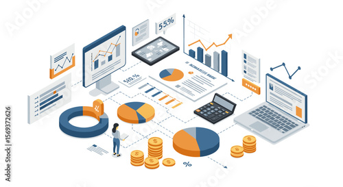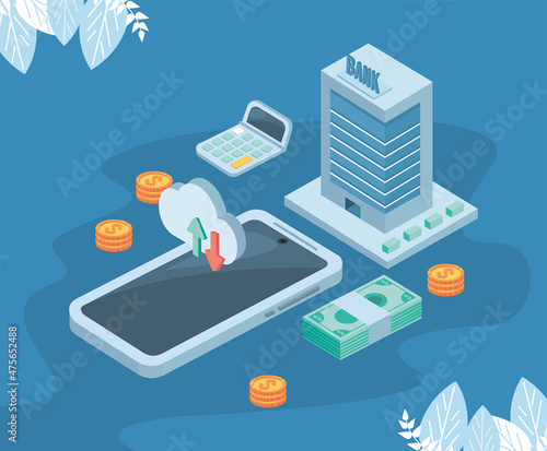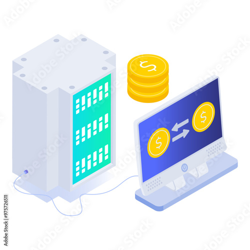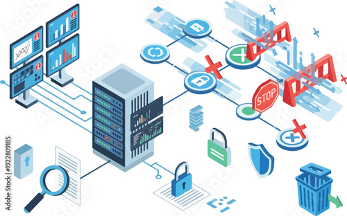 Блок-схема центра обработки данных, векторная иллюстрация. Изометрический портативный компьютер, мобильный телефон, стойки серверной комнаты, Wi-Fi роутер. Облачное хранилище, передача данных.