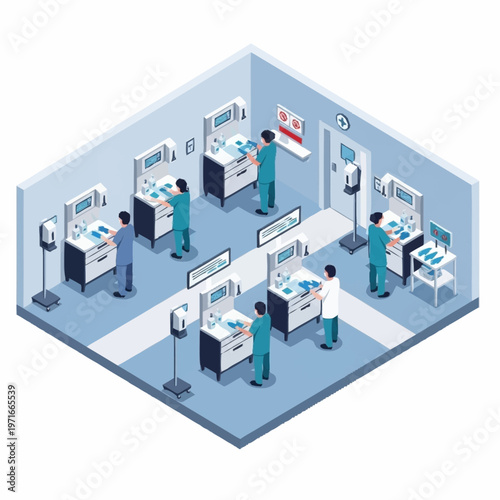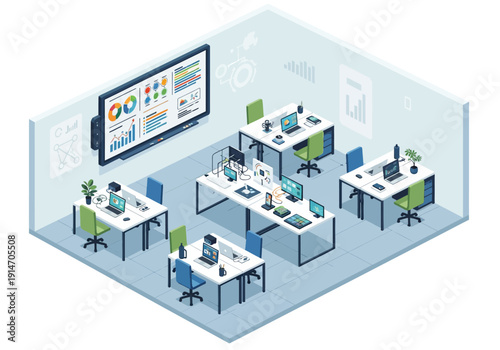 Центр обработки данных или серверная комната с серверными стойками и компьютерным оператором, персонажами системного администратора, плоская векторная изометрическая иллюстрация. Услуги центра обработки данных.