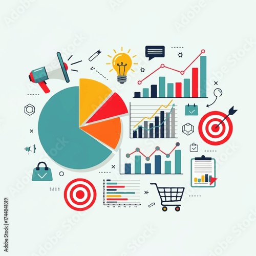 Микро-мужские и женские персонажи офисных людей строят огромную круговую диаграмму, собирают статистические данные и составляют отчет, презентацию, векторную плоскую иллюстрацию. Планирование, сбор и анализ данных.