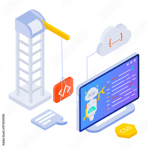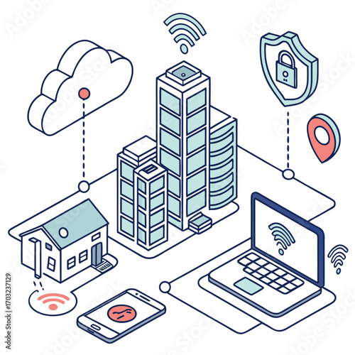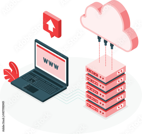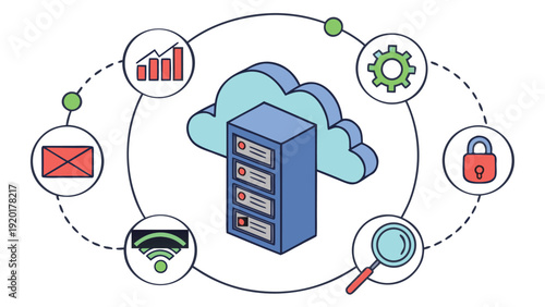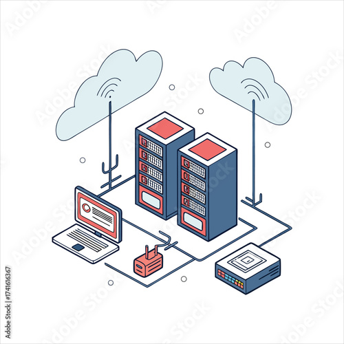 Блок-схема защиты данных, векторная иллюстрация. Серверные стойки изометрического центра обработки данных, облако, щит, компьютерные жучки, шестеренки, увеличительное стекло. Облачные технологии и защита данных.