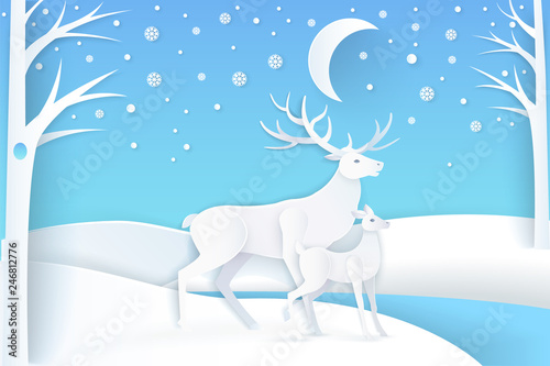 Декабрь, январь и февраль месяцы зимнего сезона. Рождественская елка, северный олень, розовые сердечки на День Святого Валентина, векторная иллюстрация в стиле бумажного искусства. Набор композиций для зимних праздников для календаря, открытки.