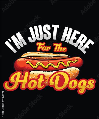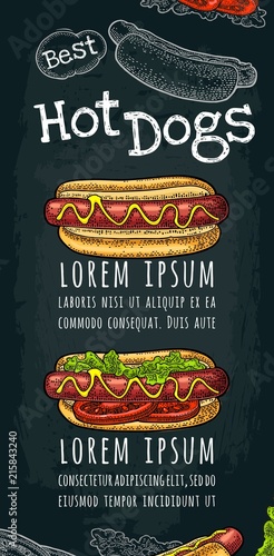 Вкусный хот-дог с лентой и текстом, векторная изолированная иллюстрация. Реалистичная булочка для хот-дога с колбасой, листьями салата, помидорами, огурцами, луком, кетчупом и горчицей. Рекламные баннеры быстрого питания.
