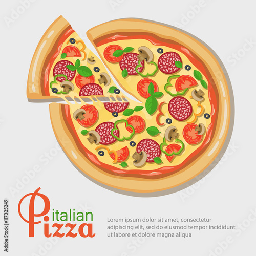 Вкуснейшая итальянская пицца. Векторная иллюстрация в стиле многослойной вырезки из бумаги с видом сверху. Различные виды ломтиков пиццы с салями, сыром, помидорами, моцареллой, грибами, ананасами, оливками, морепродуктами.