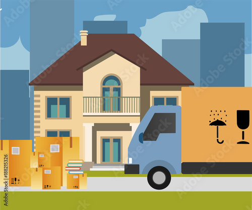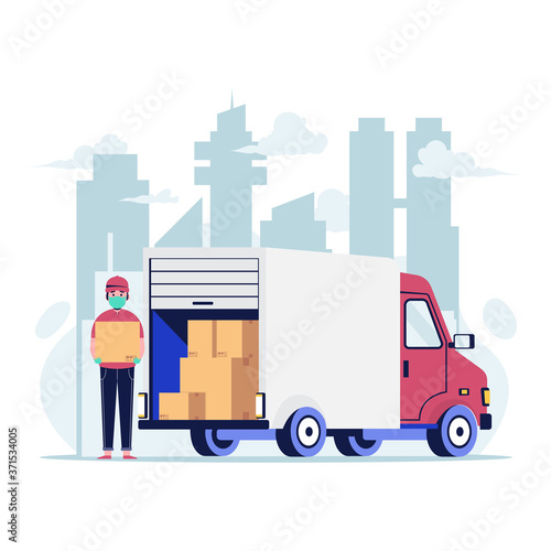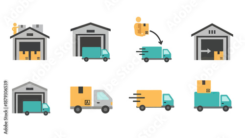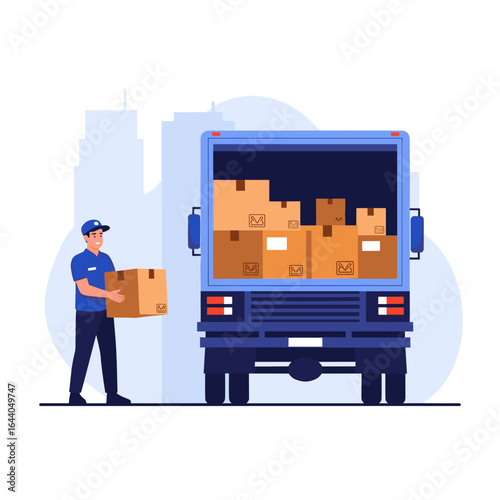 Векторная иллюстрация склада, грузовика для доставки, посылок, рабочего, статистических гистограмм и диаграмм. Логистика доставки концепции транспортировки доставки для веб-баннера, страницы веб-сайта, презентации и т.д.