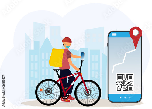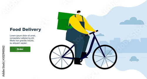 Курьер, курьер едет на велосипеде с коробкой еды на спине, плоская векторная иллюстрация. Пицца, фаст-фуд онлайн-заказ. Городская служба доставки еды на велосипеде.
