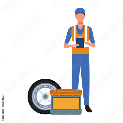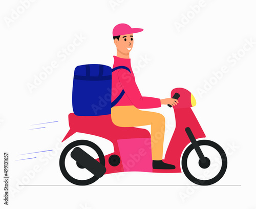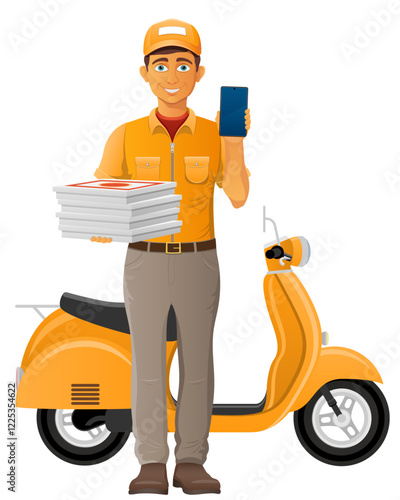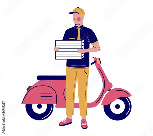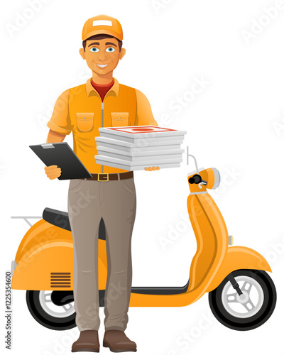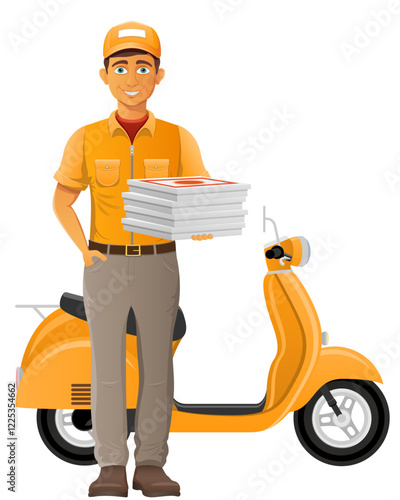 Разносчик с коробками пиццы, стоящий перед мотороллером, плоская векторная иллюстрация. Концепция доставки пиццы.