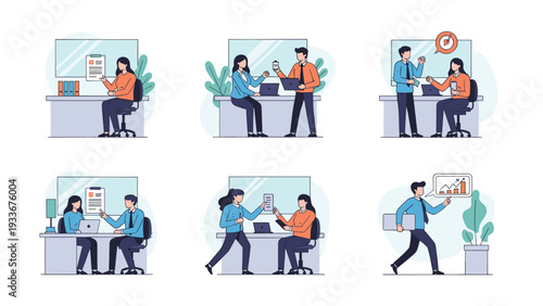 Векторная иллюстрация менеджера работников почтовой службы, почтальона, грузчика, упаковщика и клиентов с посылками, флориста, создающего цветочную композицию. Элементы дизайна в плоском стиле, выделенные на белом фоне.