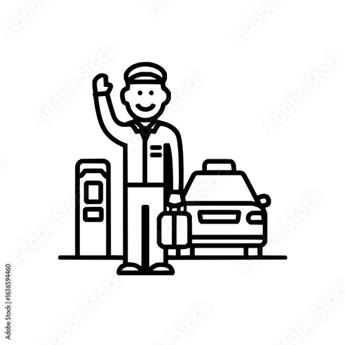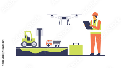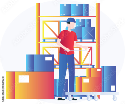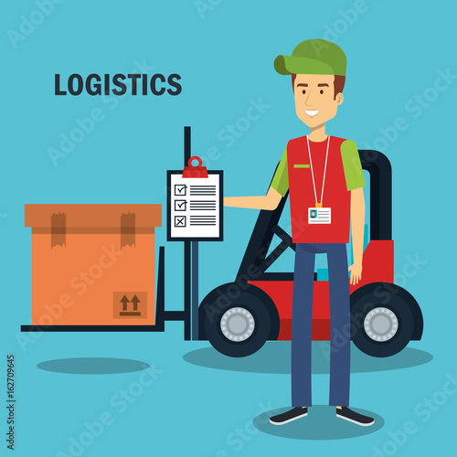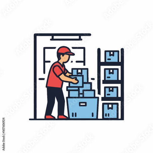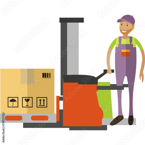 Векторная иллюстрация погрузчика, поднимающего картонные коробки с помощью автопогрузчика. Концепция доставки людей элемент дизайна в плоском стиле, значок, выделенный на белом фоне.