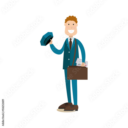 Векторная иллюстрация улыбающегося почтальона с почтовой сумкой и письмами. Концепция доставки людей элемент дизайна в плоском стиле, значок, выделенный на белом фоне.