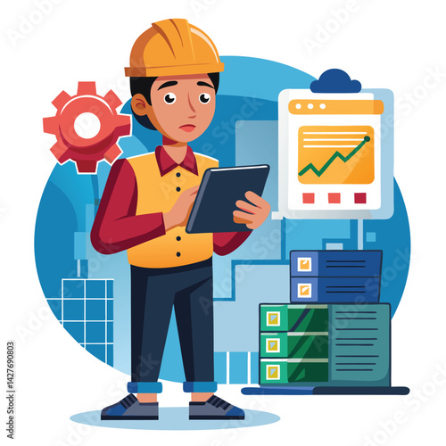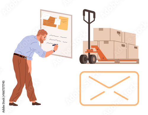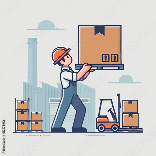 Курьер и ручная тележка, полная картонных коробок. Векторная иллюстрация дизайна в плоском стиле, изолированная на белом фоне. Концепция запаса доставки для веб-баннера, страницы веб-сайта и т.д.
